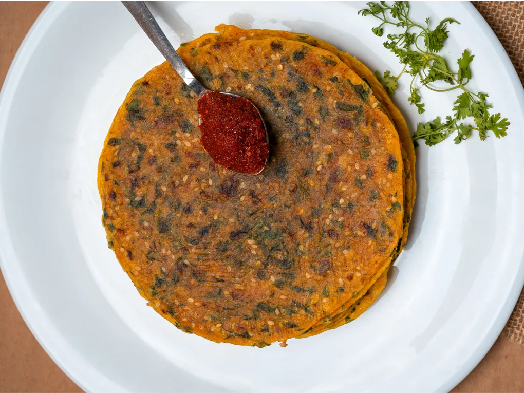 Methi-Lasun-til Thepla brings a savory, aromatic twist to the traditional thepla, incorporating the flavors of fenugreek (methi) and garlic (lasoon) and sesame seeds(til). These herbal, fragrant flatbreads are made with whole wheat flour, fresh methi leaves, garlic, and a mix of Gujarati spices that provide a unique, rich flavor.